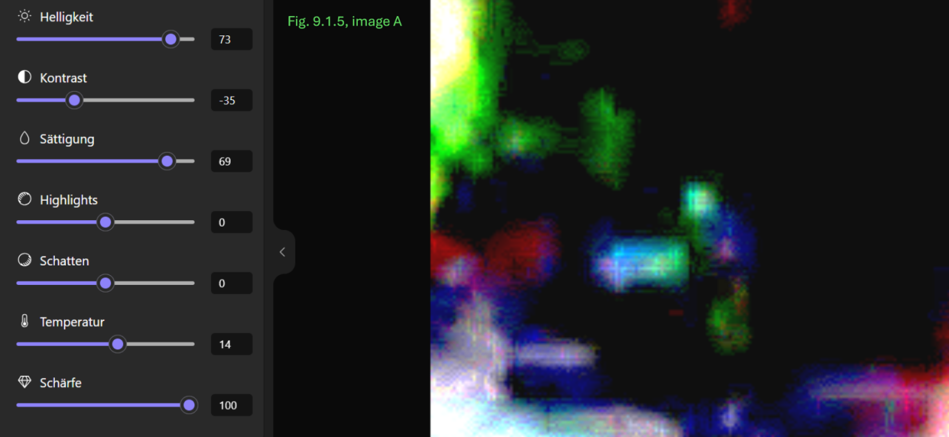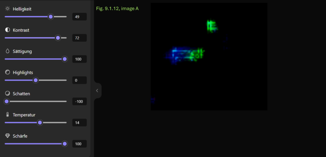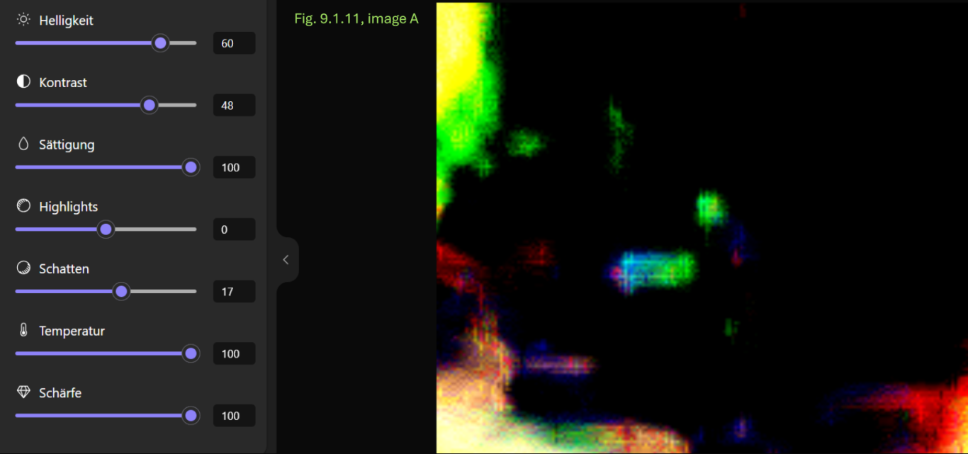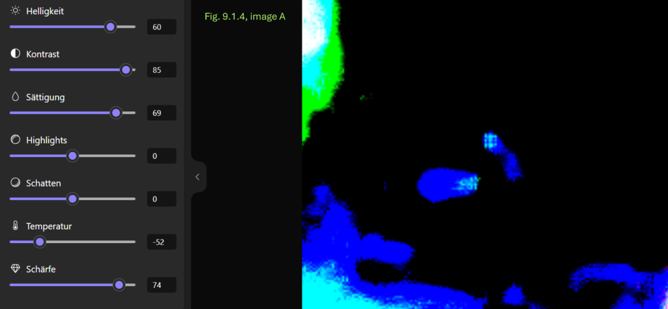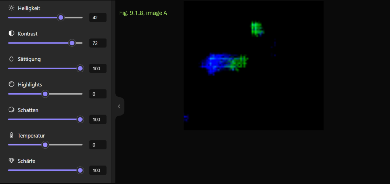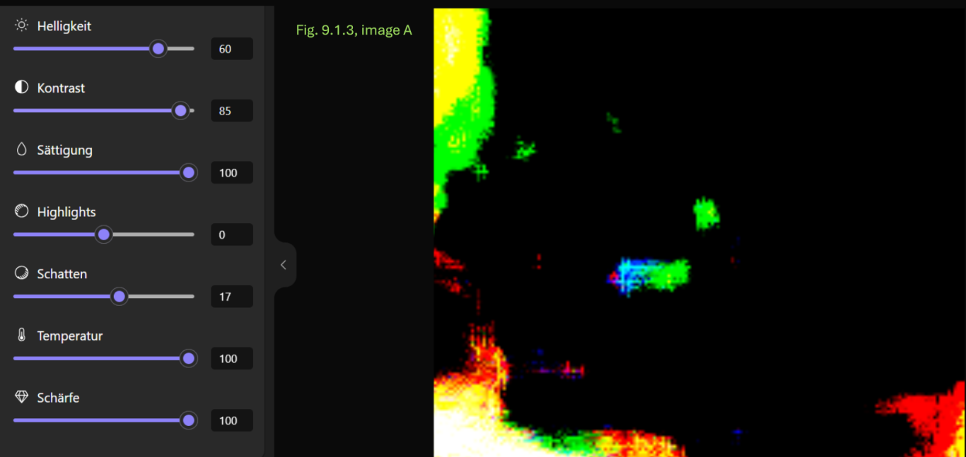 - Konsistenz: Die Annahme einer breiigen oder flüssigen Konsistenz wird dadurch gestützt, dass dieser Bereich sich in allen Anpassungskombinationen transparent und mit einer schwachen Farbintensität als homogene Fläche zeigt.