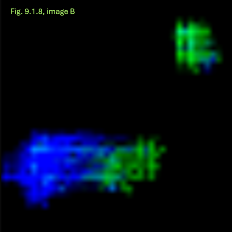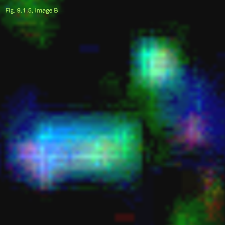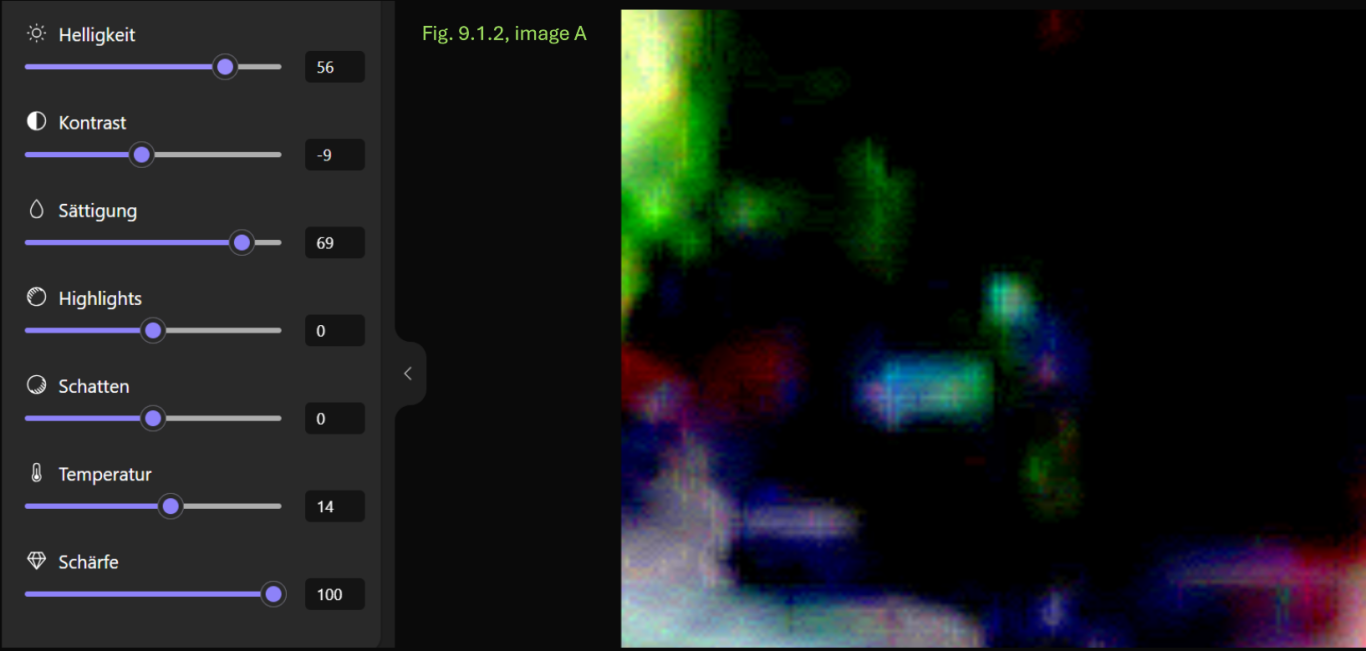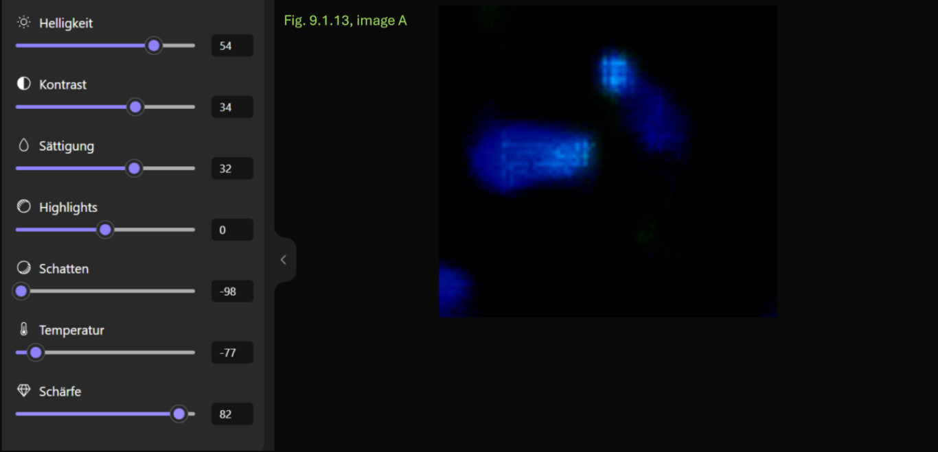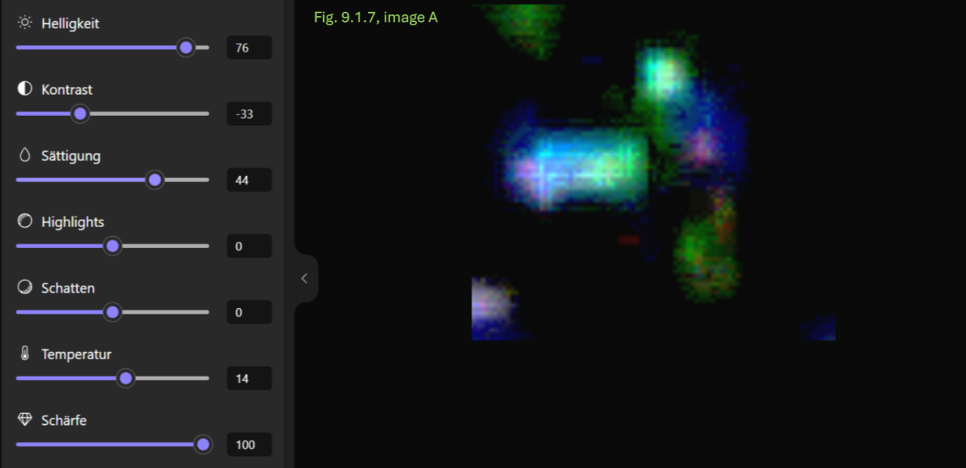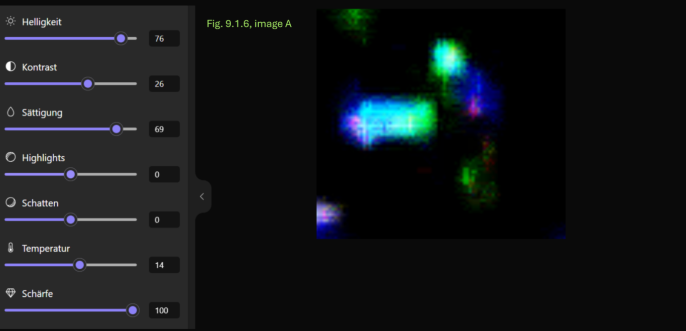 - Konsistenz: Die Annahme einer breiigen oder flüssigen Konsistenz wird dadurch gestützt, dass dieser Bereich sich in allen Anpassungskombinationen transparent und mit einer schwachen Farbintensität als homogene Fläche zeigt.