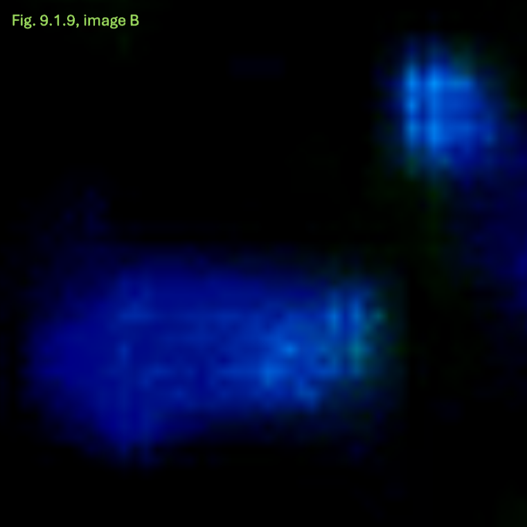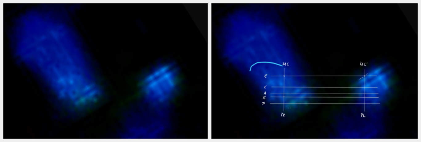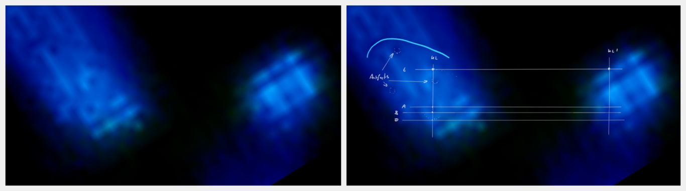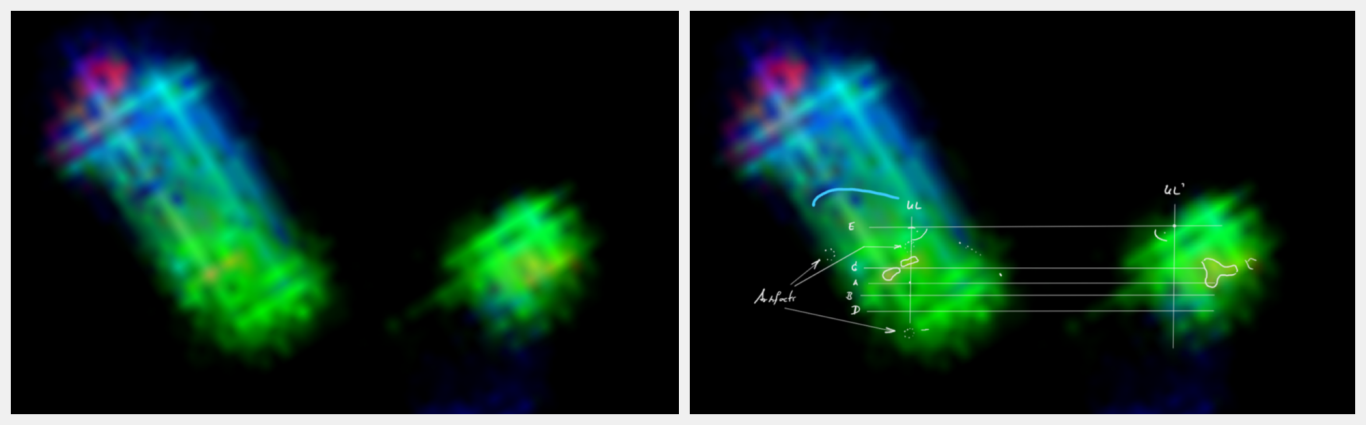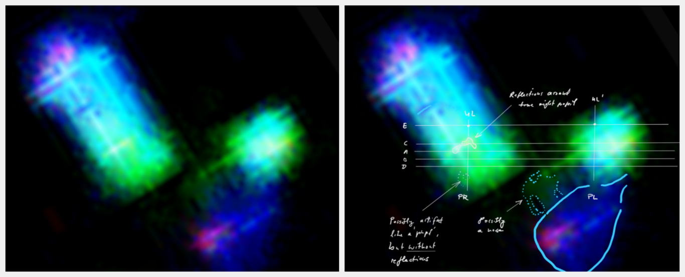 Das Behältnis: der Tank (linkes und mittleres Bild): Durch die Lumineszenz entstehenden Artefakte, als Linien sichtbar (siehe gelbe Markierungen) überlagern die unterliegenden Artefaktlinien des Versorgungselements, dem Tank. Die basalen Strukturen des Tanks (der Boden), ebenfalls als Artefaktlinien sichtbar und in definierter Form, bestätigen die zuvor diskutierte scheinbar eckige und kantige Form des Tanks.
