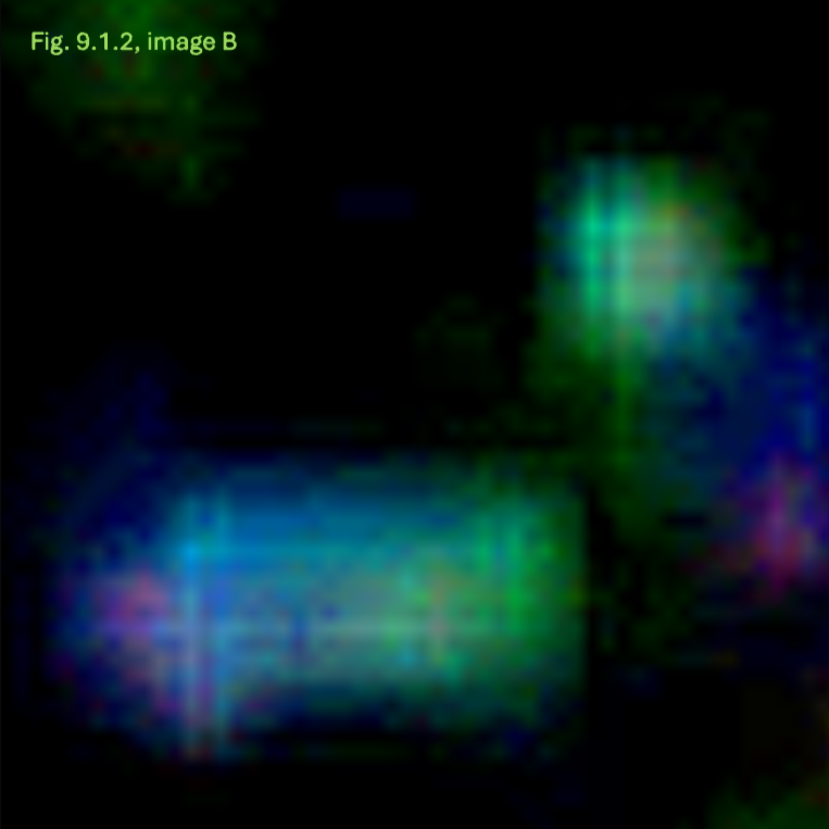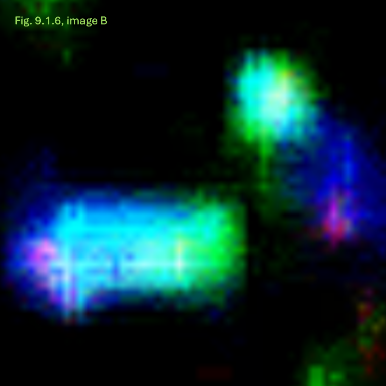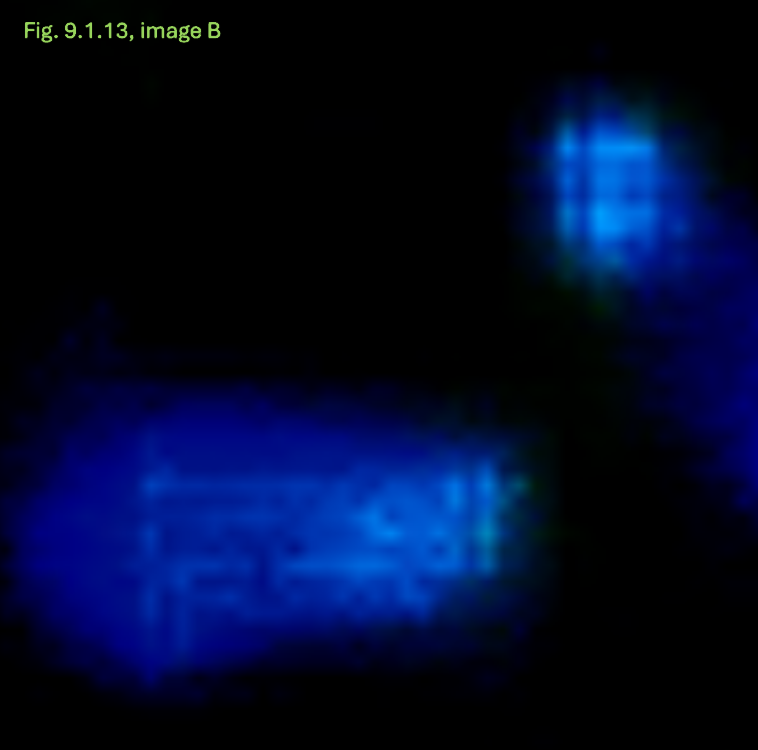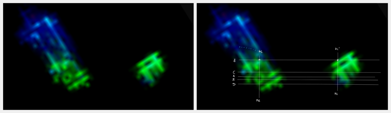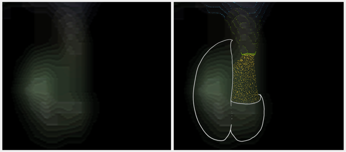 Das Behältnis: der Tank (linkes und mittleres Bild): Durch die Lumineszenz entstehenden Artefakte, als Linien sichtbar (siehe gelbe Markierungen) überlagern die unterliegenden Artefaktlinien des Versorgungselements, dem Tank. Die basalen Strukturen des Tanks (der Boden), ebenfalls als Artefaktlinien sichtbar und in definierter Form, bestätigen die zuvor diskutierte scheinbar eckige und kantige Form des Tanks.