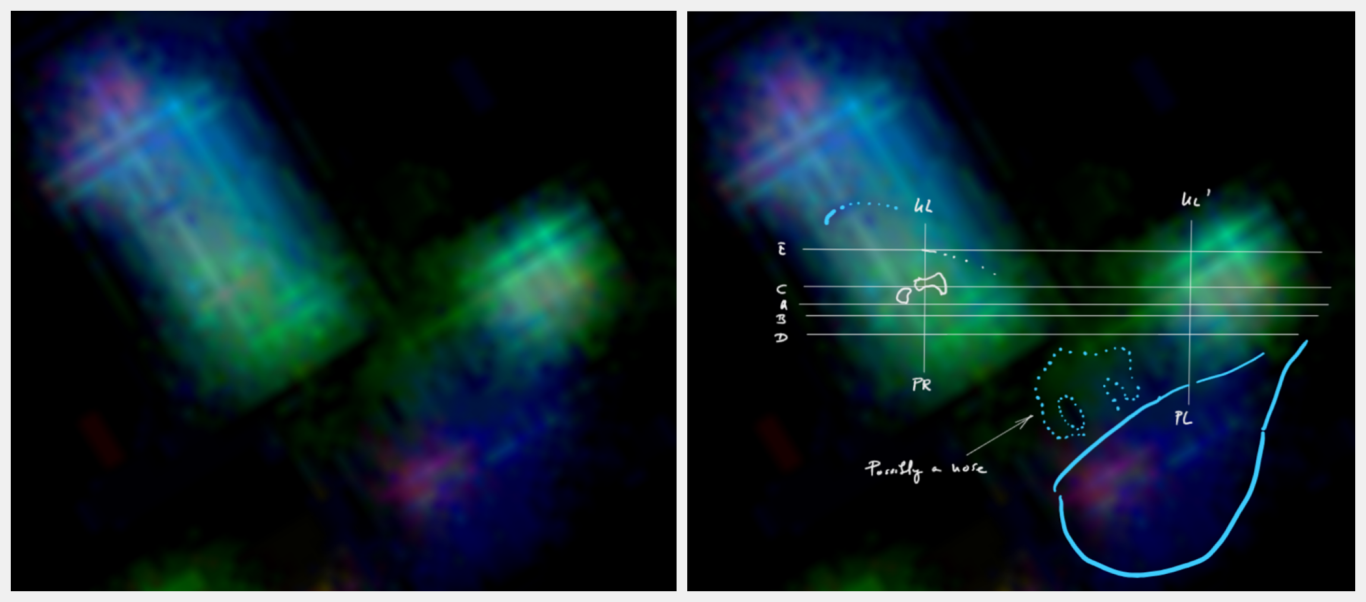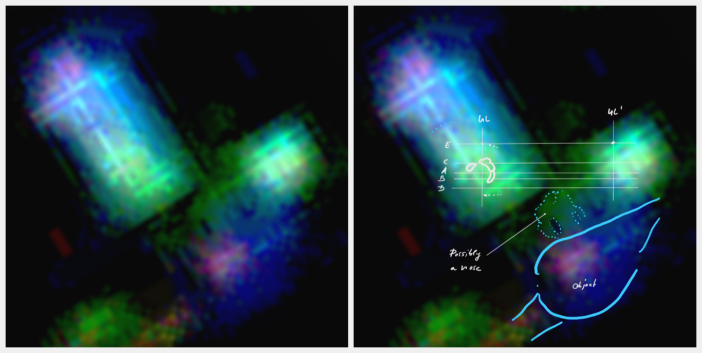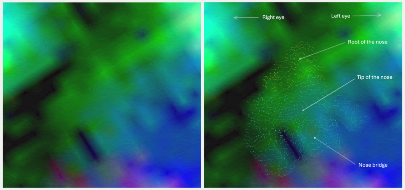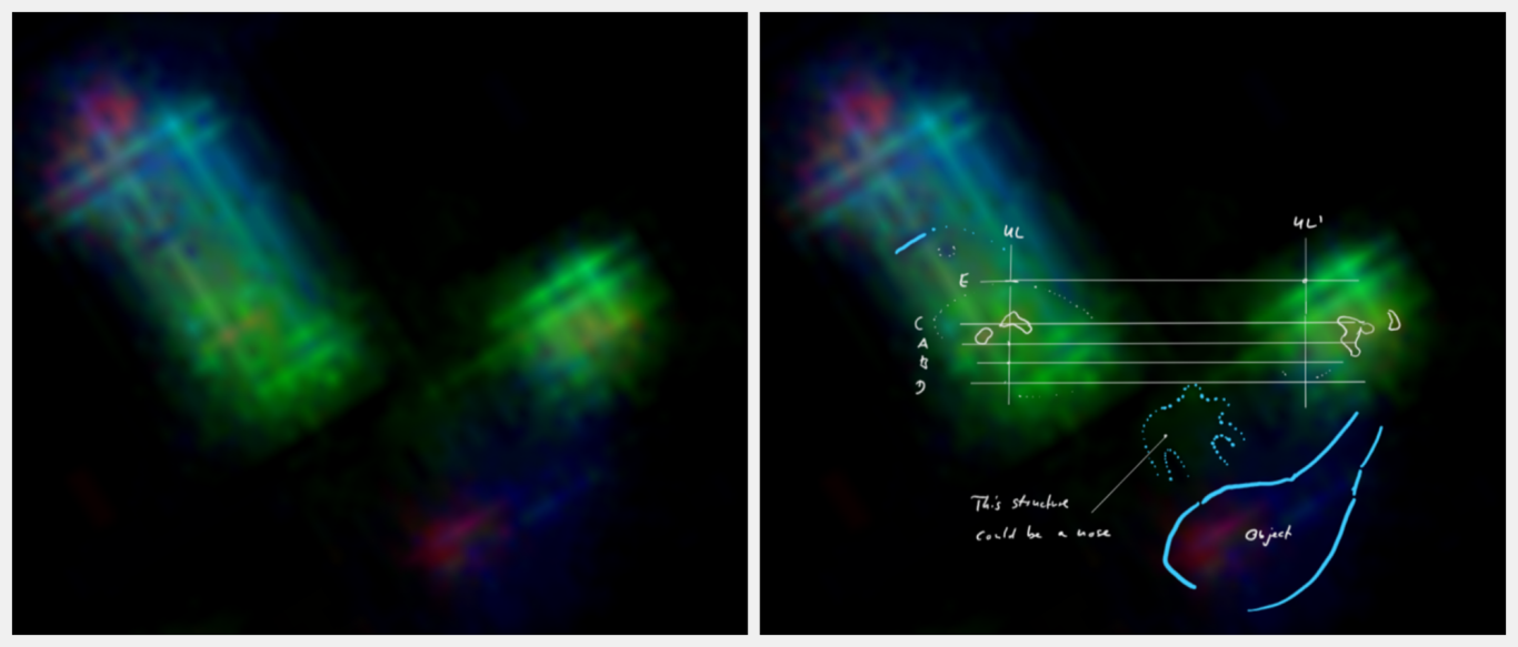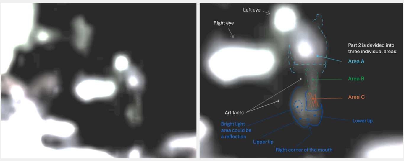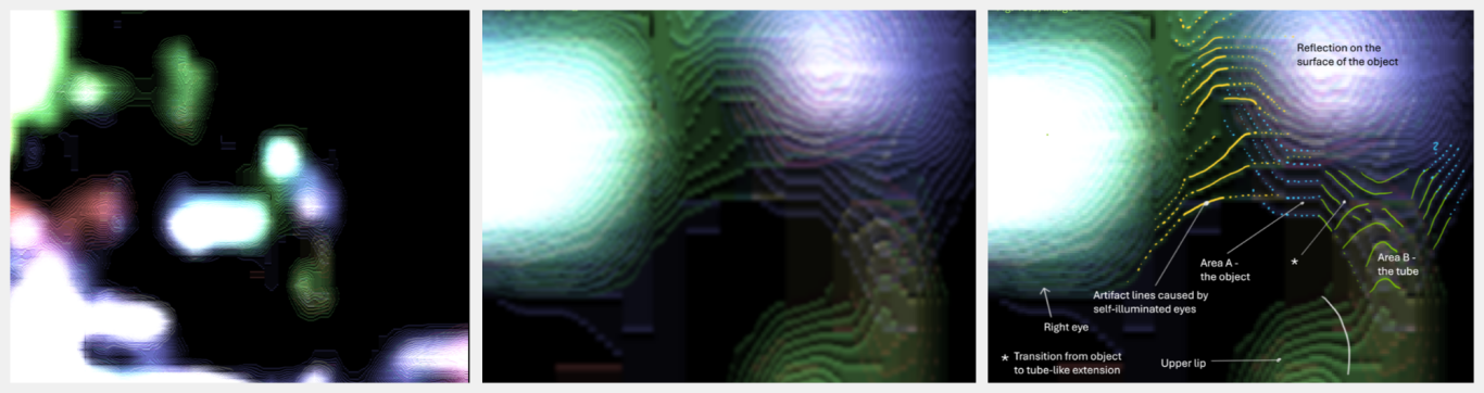 - Nachgewiesene 3D-Nasenstruktur: Die Analyse der Nasalregion zeigte kohärente Linienverläufe, die eine dreidimensionale Struktur erkennen lassen, einschließlich Nasenwurzel, -spitze und differenzierter Nasenöffnungen. Diese räumliche Abgrenzung und die homogene, differenzierte Farbgebung der Nasenstruktur untermauern die Existenz einer geordneten, physikalischen Anatomie und grenzen diese von zufälligen Bildartefakten ab.
