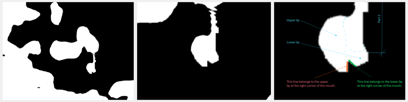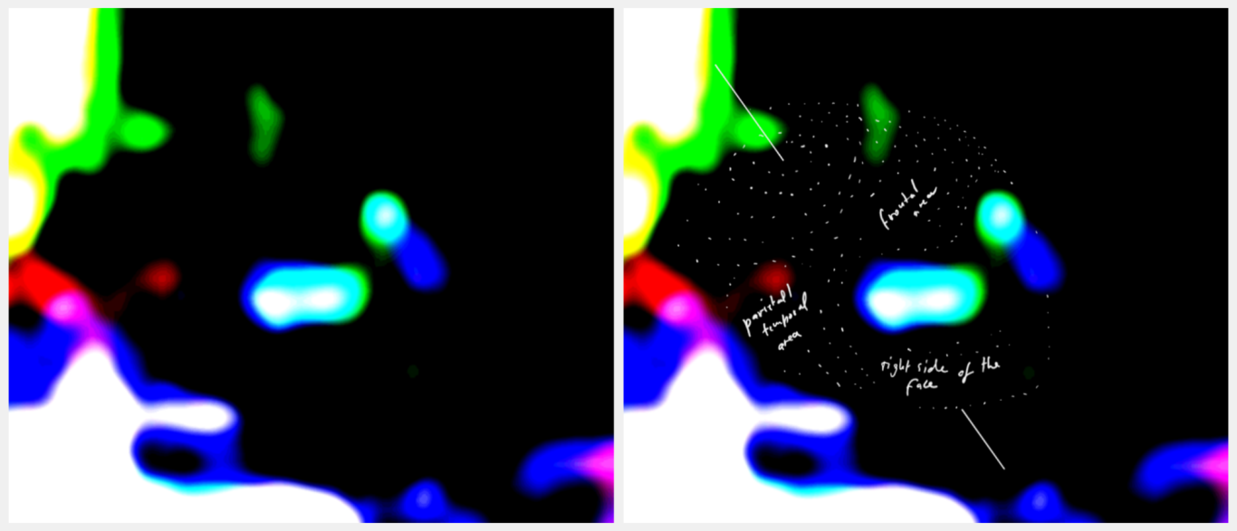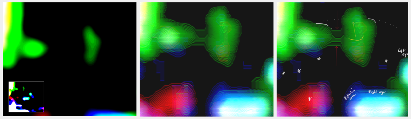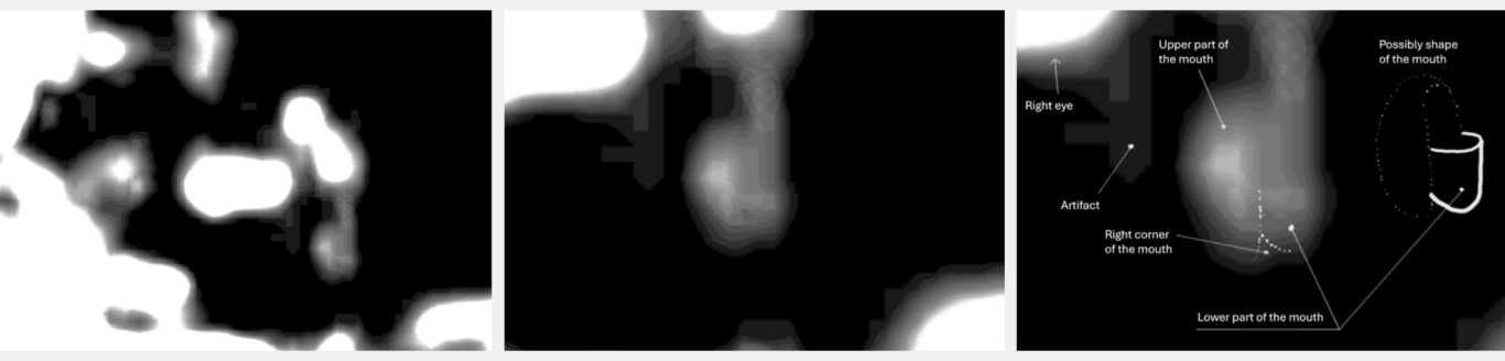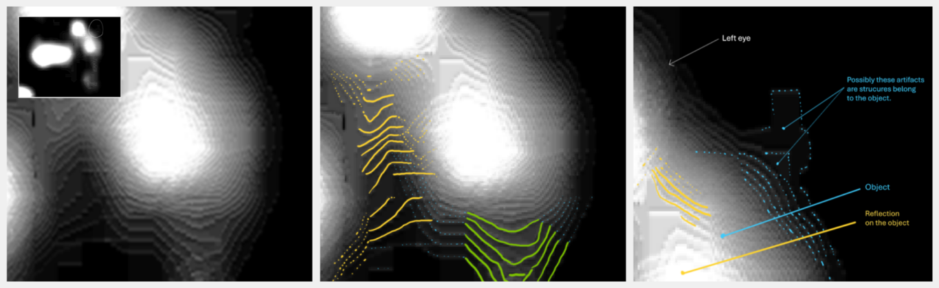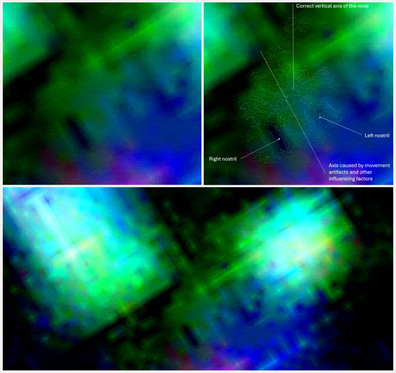 - Nachgewiesene 3D-Nasenstruktur: Die Analyse der Nasalregion zeigte kohärente Linienverläufe, die eine dreidimensionale Struktur erkennen lassen, einschließlich Nasenwurzel, -spitze und differenzierter Nasenöffnungen. Diese räumliche Abgrenzung und die homogene, differenzierte Farbgebung der Nasenstruktur untermauern die Existenz einer geordneten, physikalischen Anatomie und grenzen diese von zufälligen Bildartefakten ab.