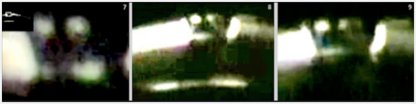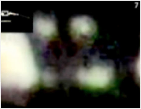 Die charakteristischen Strukturen des Tubus sind klar nachgezeichnet (grüne Markierungen). Es können reflektierende Bereiche auf dem Tubus erkannt werden. Sie sind ein starker Hinweis darauf, dass der Tubus aus fester Materie besteht und somit physisch im dreidimensionalen Raum vorhanden ist. Die für das Entstehen der Reflexion verantwortlichen Lichtquellen sind die lumineszierenden Augen und der helle UAP-Vordergrund.