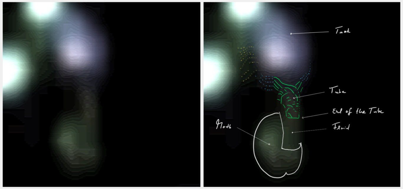 Flüssigkeit/Interface: Eine offensichtlich aus dem Tubus strahlförmig austretenden Flüssigkeit (Substrat) erscheint transparent und erstreckt sich in die weiß umrandete Mundstruktur (Mundgrenzfläche).