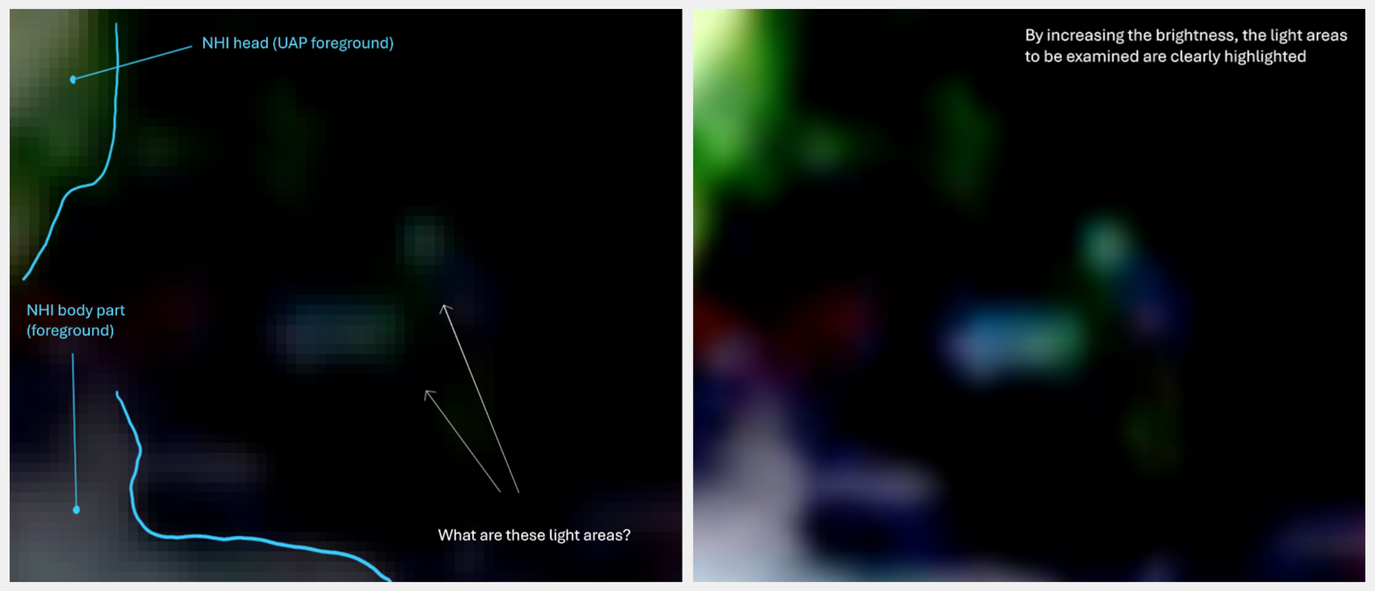 Die auffällige Diskrepanz der Sichtbarkeit – klare Detailerkennung des CBE-Versorgungssystems (Tank, Tubus, Medium C) im Kontrast zur fast vollständigen Unsichtbarkeit der weiter vorne im hellen UAP-Vordergrund positionierten "normalen Greys" – erfordert eine Erklärung, die über konventionelle Beleuchtung hinausgeht.