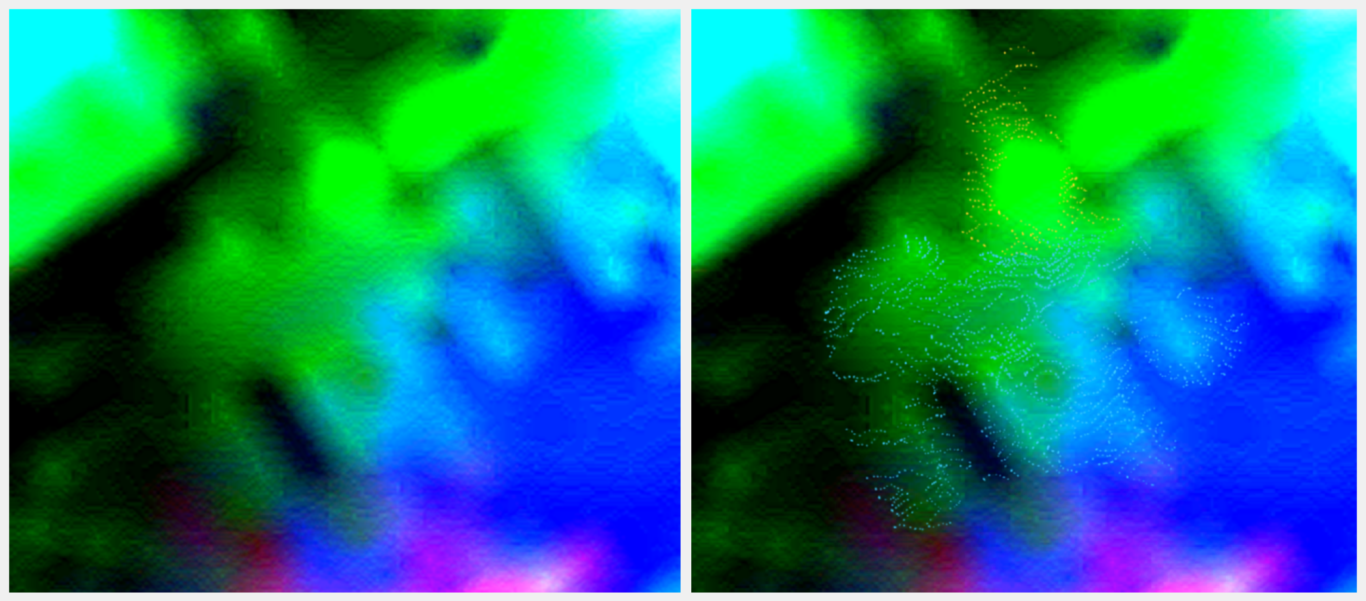 The interaction of the two artifact types is of particular analytical interest. The greenish light artifact lines (marked yellow) appear to lie completely above the black-violet structural lines of the Tank or completely obscure them. The light artifacts appear transient (transparent). In areas fully covered by the light artifacts, a clear interruption of the recognizable Tank lines is observed. This phenomenon provides an unambiguous indication of the material (physically solid) structure of the Tank.